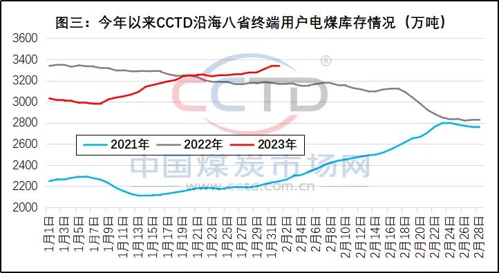 另一方(fāng)面,今年12月8日(ri),“CCTD沿海八省動(dòng)力煤終端用(yong)戶數據”所覆(fu)蓋⛷️發🚶電企業(yè)的電煤庫存(cun)為3338.4萬噸、同比(bǐ)增加🐆170.5萬噸,處(chù)于🐅近幾年同(tóng)期高☂️位(見圖(tu)三),當天的庫(ku)存可用天數(shù)為21.5天,也處于(yu)偏高狀态。